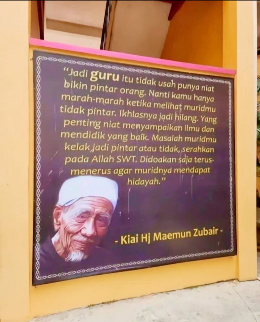 Di sebuah dinding pesantren sederhana, terpampang kalimat penuh makna dari sosok ulama kharismatik bangsa: “Jadi guru itu tidak usah punya niat bikin pintar orang. Nanti kamu hanya marah-marah ketika melihat muridmu tidak pintar. Ikhlasnya jadi hilang. Yang penting niat menyampaikan ilmu dan mendidik yang baik…”
