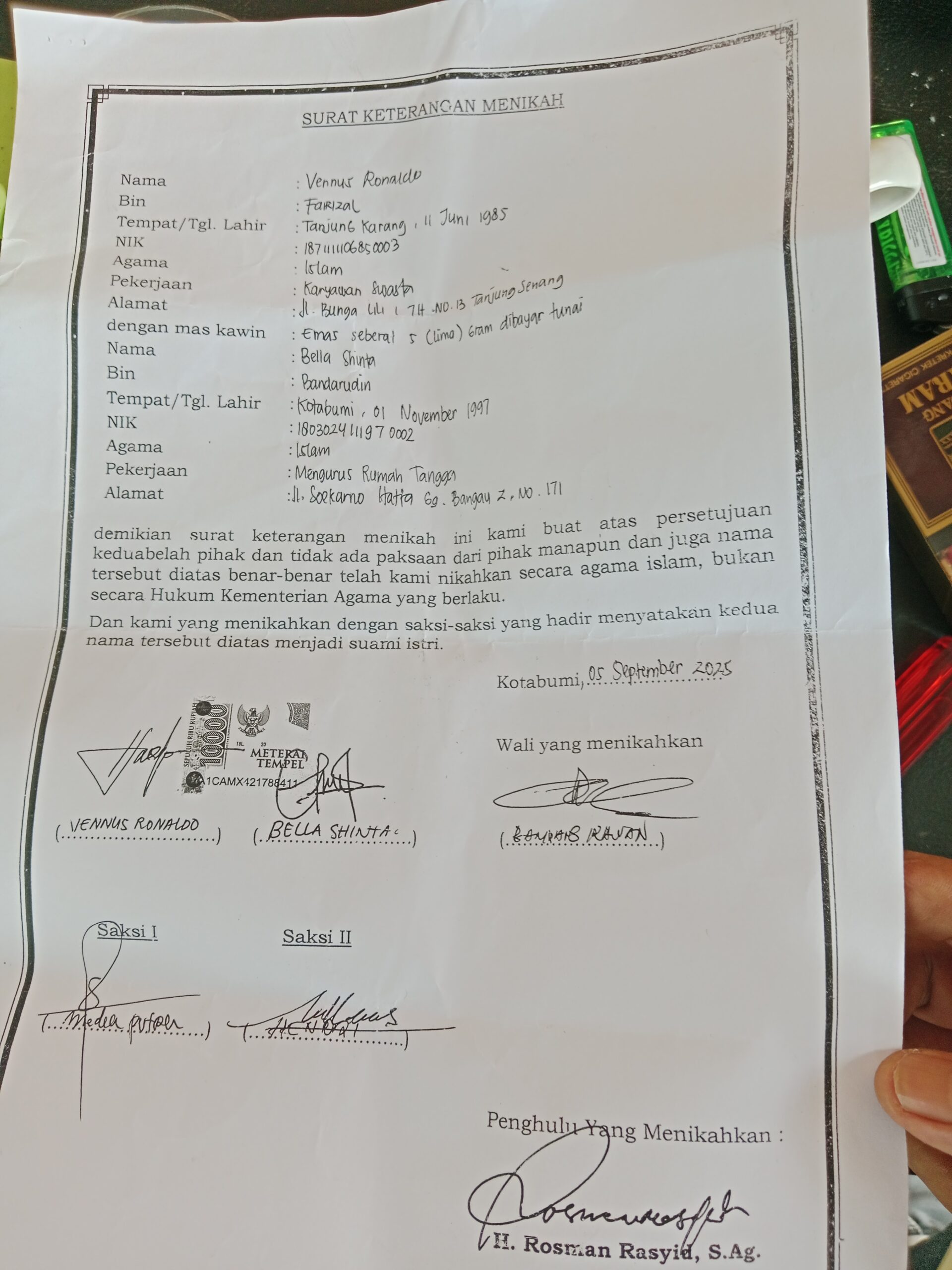 Isi dokumen menyebut pernikahan berlangsung secara agama. Namun, dokumen itu tidak mencantumkan pencatatan resmi negara. Karena itu, status pernikahan tidak memiliki legalitas hukum.