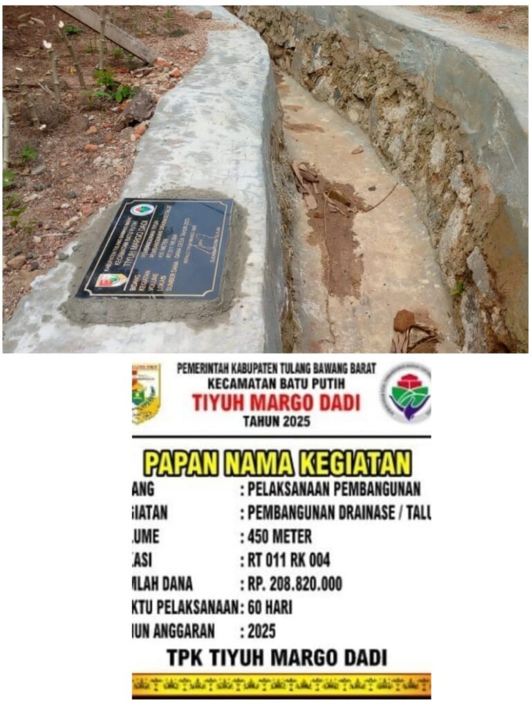 Tulang Bawang Barat,q-koko.site – Untuk meningkatkan Tiyuh yang sehat dan nyaman pemerintah Tiyuh Margodadi kecamatan batu putih kabupaten tulang bawang barat Realisasikan dana desa tahun 2025 untuk pembangunan Drainase.