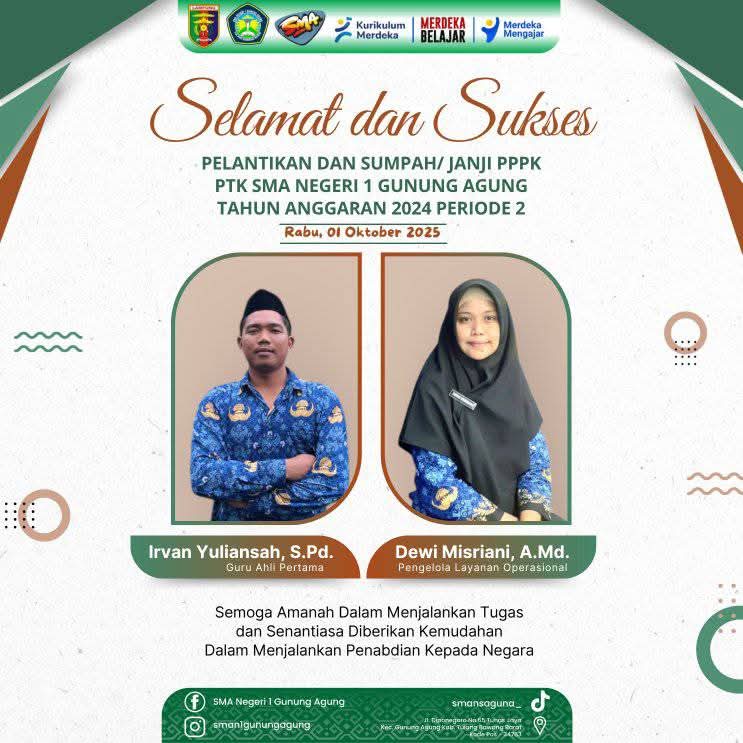Tulang Bawang Barat, q-koko.site — Keluarga besar SMA Negeri 1 Gunung Agung menyampaikan ucapan selamat dan sukses atas pelantikan serta pengambilan sumpah/janji Pegawai Pemerintah dengan Perjanjian Kerja (PPPK) Formasi PTK Tahun Anggaran 2024 Periode 2.